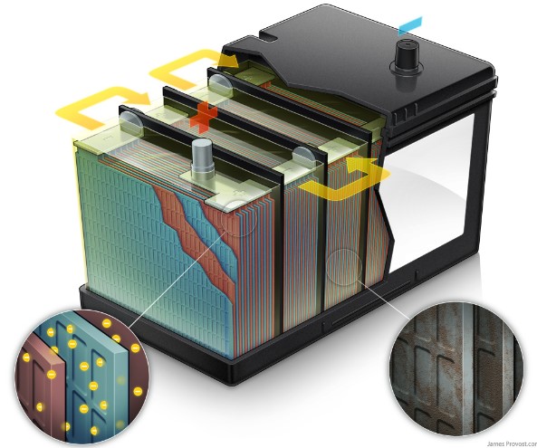 Батарея акумулює і видає електричну енергію рахунок складних електрохімічних реакцій, у яких відбувається перетворення електричної енергії на хімічну при заряді батареї і хімічної на електричну при розряді, відповідно. В основному, всі стартерні акумулятори, про які йдеться, за принципом пристрою і елементами, що діють, є свинцево-кислотними. Вони складаються з осередків (банок), в яких електроліт занурені позитивно і негативно заряджені свинцеві гратчасті пластини. На пластинах нанесено активну масу, яка утримує електрони. Осередки послідовно з'єднані між собою.