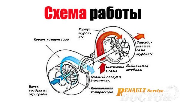 Разом зі складністю пристрою принцип її роботи відносно простий. На одному валу встановлено дві частини, т.зв. гаряча і холодна "равлики" турбіни. У гарячій частині встановлено колесо турбіни, яке рухається вихлопними газами. На одному валу з турбіною, але в холодній частині, встановлено колесо компресора, яке стискає повітря, що спрямовується у колектор впускний двигуна. Таким чином, що більший обсяг і швидкість вихлопних газів (тобто обороти двигуна), то швидше обертається колесо турбіни і тим більший тиск створюється у впускному тракті. І навпаки, чим менші обороти двигуна, тиск вихлопних газів менший, і менший тиск, що нагнітається турбіною, цей ефект називають «турбояма».